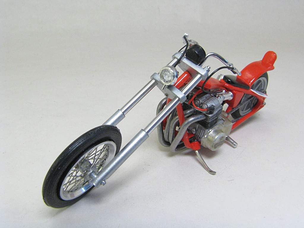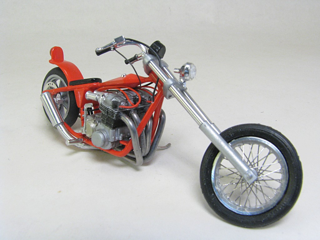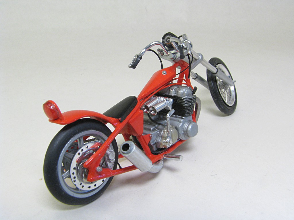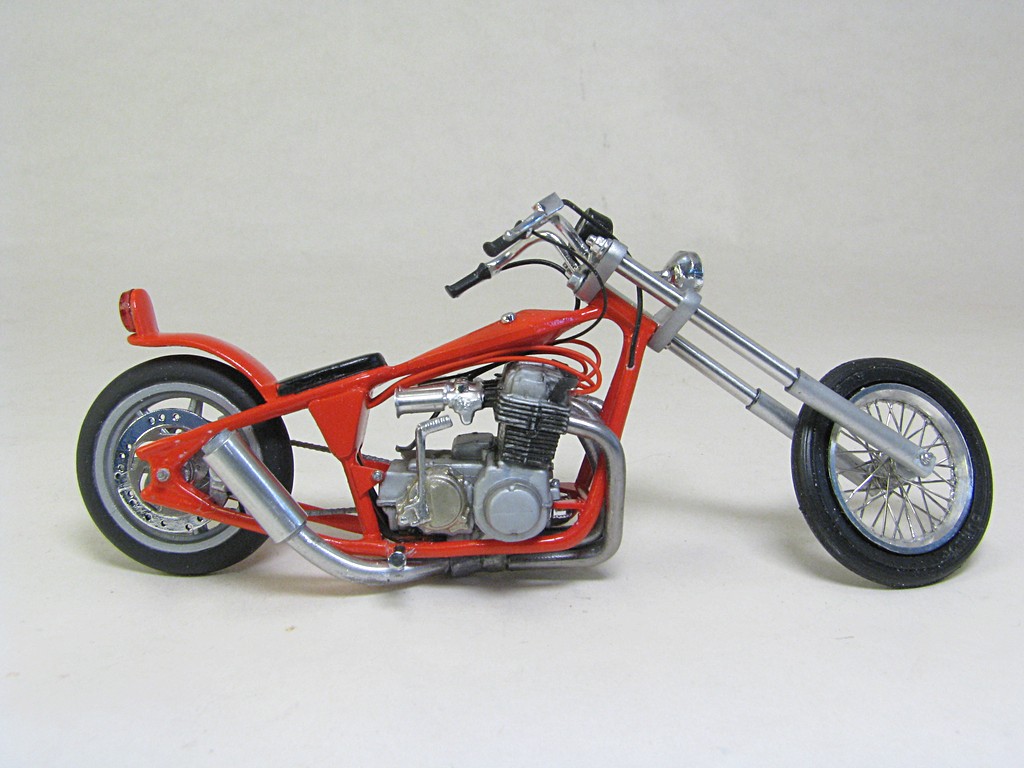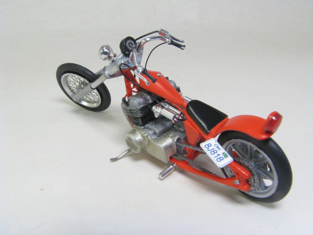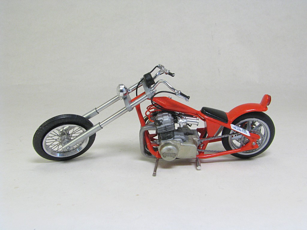 | Honda Chopper This model kit was included in the MPC 1980 Chevrolet Monte Carlo kit (and perhaps a few others over the years). There was a nice motorcycle trailer also included. This models was sourced from an eBay seller who was selling just the motorcycle and trailer. It uses the same Honda inline four engine used in the MPC Trick Trikes. Base Kit(s): MPC 1980 Chevrolet Monte Carlo (kit number 967M) Finished: Nov 2025 Modifications/Additions: - brake cable and rear brake caliper (scratchbuilt) - throttle and clutch cables - headlight and taillight from parts box - speedometer from Maisto diecast - spark plugs and wiring from Greg’s Scale Model Accessories (Ted’s Modeling Marketplace) - oil lines from 0.8 mm (0.031”) diameter cable from Tamiya, with the connection points from aluminum wire - exhaust pipe from 1.5 mm (0.060”) diameter aluminum wire used for bonsai trees - scratchbuilt muffler - scratchbuilt front forks and triple trees (styrene and aluminum rod) - front wheel is a 0.71" OD wire wheel from minicurt8zing, rear wheel is front wheel from the kit - custom printed license plate - paint on main parts is Tamiya LP-50, airbrushed, Tamiya LP-38 flat aluminum on engine block, Alclad gold titanium on engine covers Click on Thumbnail to see detailed image. These images are 1024 x 768 and should load reasonably quickly, depending on your connection speed. |