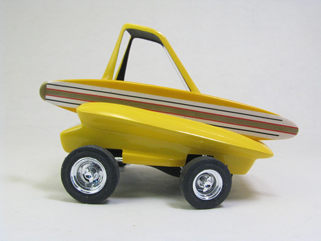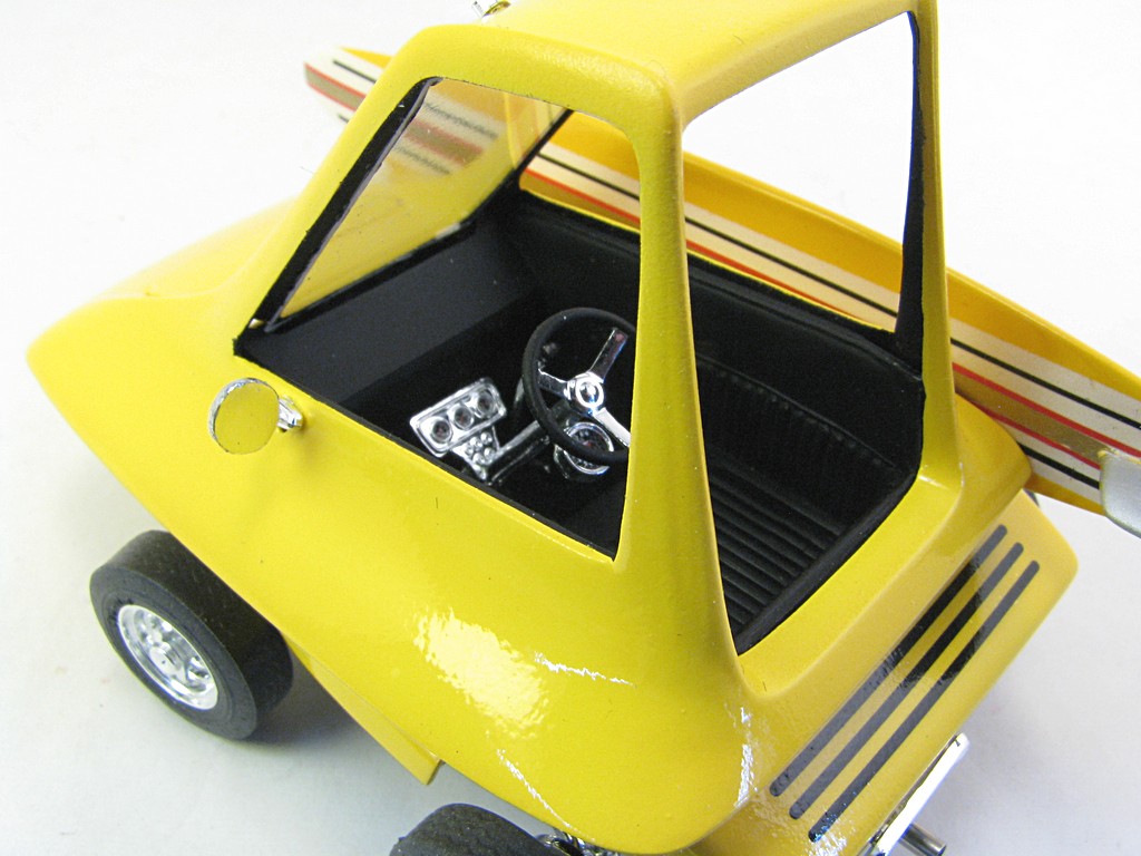 | Surfite (Ed 'Big Daddy' Roth) - 1964 This model will be one of a collection of Ed 'Big Daddy' Roth cars and motorcycles. The kit came with a Tiki hut that will eventually be completed. The car was powered by a Mini Cooper engine, making it front wheel drive. The car appeared briefly in the move "Beach Blanket Bingo". Base Kit(s): Revell Surfite with Tiki Hut (kit number 1240) Finished: October 2025 Modifications/Additions: - Poseable steering - Aftermarket gauges, covered with UV clear resin - Adhesive black felt for interior floor - Spark plug wiring added - Opened up slots in front bumper area - Exhaust pipe replaced with stainless steel tubing - Stripes on surfboard are a combination of decals and masking - Paint is Tamiya lemon yellow on body, chrome yellow on surfboard Click on Thumbnail to see detailed image. These images are 1024 x 768 and should load reasonably quickly, depending on your connection speed. |