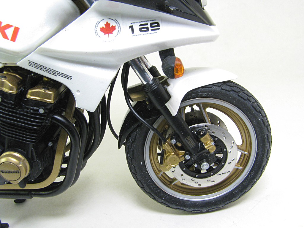 Suzuki new Katana GSX750S - Canadian version #2 This model was built to replace the original one that was sold as a commission build to the owner of a real motorcycle. These motorcycles, when sold in Canada, had some Canadian maple leaf decals and were given sequential numbers. They also did not have the integrated turn signals, but wider turn signals added. Base Kit(s): Tamiya Suzuki New Katana GSX750S (kit number 14034) Finished: Nov 2024 Modifications/Additions: - photoetch brake disks (from Hasegawa Suzuki RG400 detal set) - 3D printed chain, from Falcon Scale Models - Most frame bolt heads replaced with Meng versions - Modified sidestand and added springs to both sidestand and centerstand - Top Studio throttle cable - Aftermarket resin tire valves - Custom printed license plate - Custom printed Canadian maple leaf decal and number - Bodywork paint is Tamiya TS-26 pure white, LP clear pearl and LP clear, airbrushed, Tamiya TS gold decanted for the frame, wheels and engine covers. Click on Thumbnail to see detailed image. These images are 1024 x 768 and should load reasonably quickly, depending on your connection speed. |