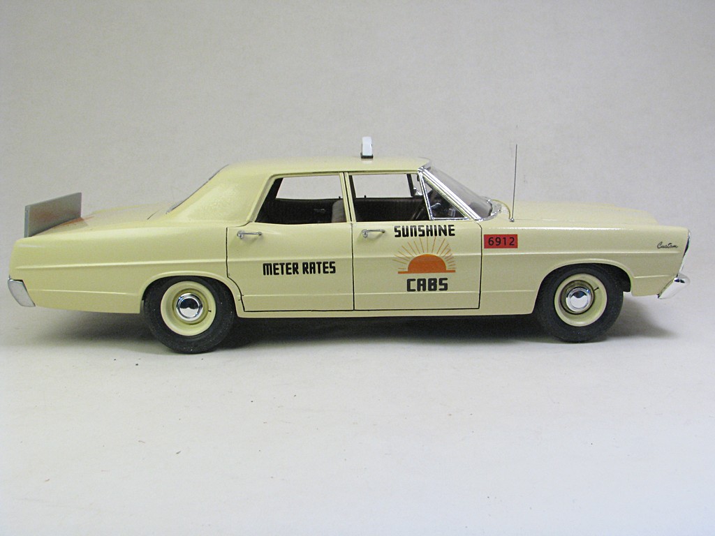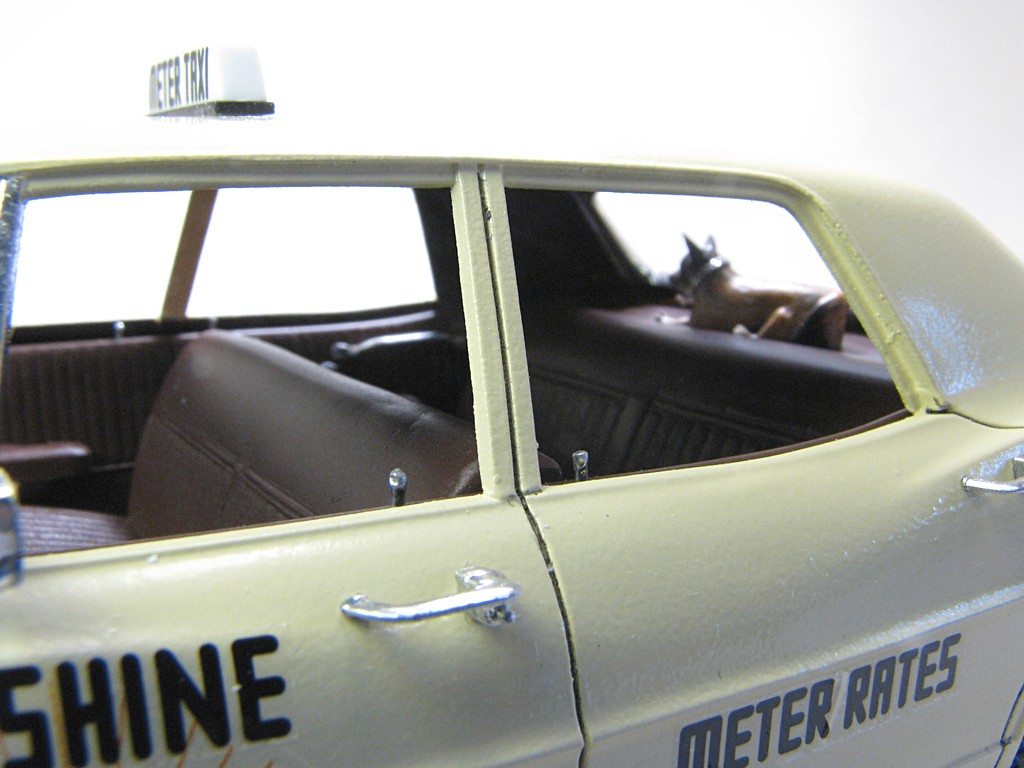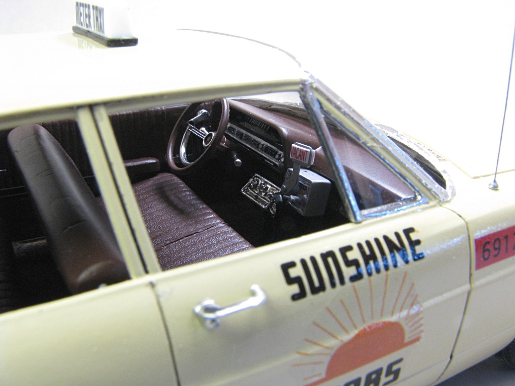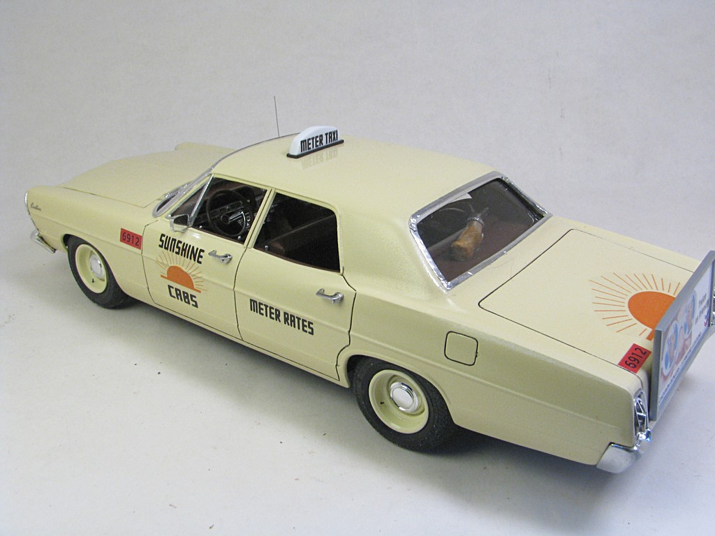 | 1967 Ford Custom 500 taxi (Bullitt movie) This is another addition to the collection of the 'Cars of the movie Bullitt', which was released in 1968. The late Robert Duvall was the taxi driver of this car as he drove Steve McQueen around to various locations in San Francisco. This model grafted the roof of an AMT Ford Interceptor Police Car kit (a 1970 Ford Galaxie 500) onto the body of an AMT Ford Galaxie convertible. The actual car in the movie was a Ford Custom 500, which was sold as fleet vehicles to police departments, taxi compnanies, etc. It differs from the Ford Galaxie in having fewer chrome moldings and a simpler interior. Base Kit(s): AMT 1967 Ford Galaxie (kit number 6117-200) Finished: April 2026 Modifications/Additions: - added roof from Ford Police Car kit and reshaped rear window - rescribed door panel lines to change into a four door - aftermarket window cranks and interior door handles - scratchbult one interior door handle and then resin cast 3 copies - added interior door locks - modified 1:35 scale 3D printed dog for rear window shelf, as per the movie car - BestModelCarParts gauges - added turn signal stalk and gear shifter - scratchbuilt taxi meter with VACANT flag - flocked interior floor - modified police car radio with wound wire for the microphone - modified bench seats from Ford Police car kit - narrowed, headrest and roll pattern removed - custom license plate and bumper sticker to match movie car - rear part of front bumper opened up and running lights added in openeing - headlights from Czech Model Truck Model (https://www.czechtruckmodel.com/) - added radio anttenna - exterior rear view mirror from parts box - scratchbuilt taxi light on roof - exterior door handles from Canuck3D (https://canuck3d.ca/) - photoetch "Custom" script on front quarter panel - scratchbuilt rear advertising sign frame and advertisement taken from billboard photo found on the internet - rear bumper section was removed and strip styrene added to trunk - removed trim on rocker panels - custom printed license plate - all decals from Precision Design Co. (https://www.pdc.ca/rr/catalog) - interior paint is Tamiya acrylic red brown, followed by semi-gloss clear - grill and panel lines have a Tamiya panel line accent black wash - exterior crhome trim is a combination of bare metal foil and Molotow chrome - body paint is Testors Phoenecion yellow, decanted and airbrushed, followed by 1K clear, with some sections polished Click on Thumbnail to see detailed image. These images are 1024 x 768 and maybe a bit slow to load, depending on your connection speed. |