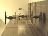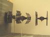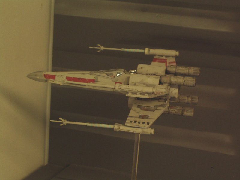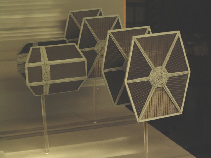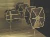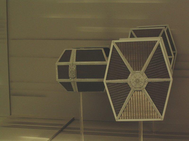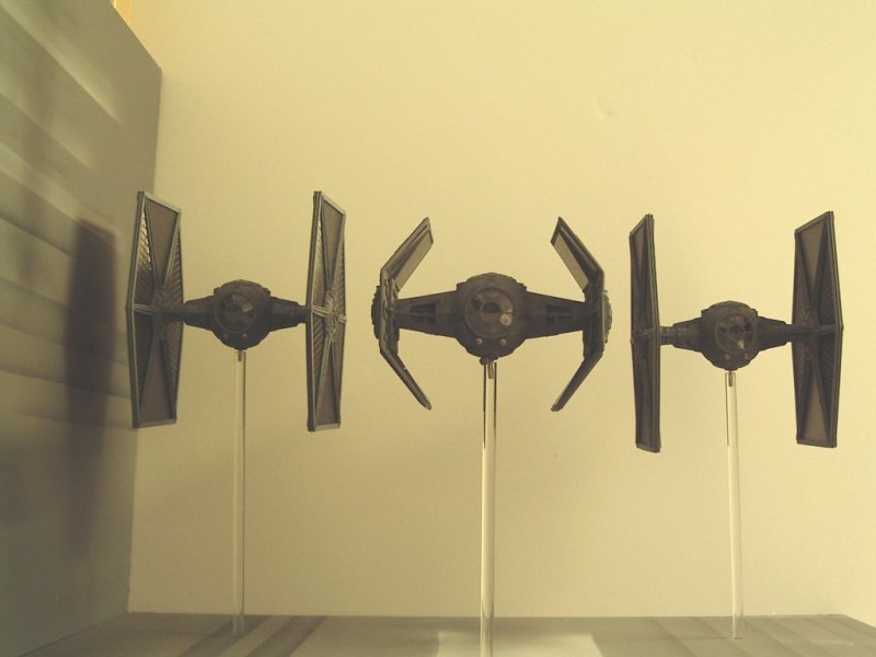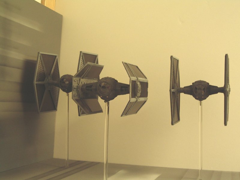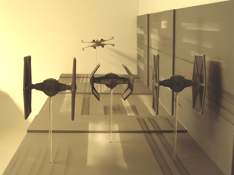 By turning the wings of the TIE Interceptor backwards, the front portion of the wings was pretty well done. I thought that I would initially make castings of the existing solar panels and splice them together to make the larger panels of the X1. However, this looked to be very time consuming and difficult to replicate accurately. In the end, I replaced all the solar panels with Evergreen V-Groove sheet styrene. This gave some texture to the panel, although not perfectly accurate. The Interceptor wings were modified to make the panel more rectangular in shape. Using sheet styrene of various thicknesses, new supports for the panels and the arms from the pod were made. This included a number of styrene shapes to replicate the detail compared to the MPC kit. The outer part of the wings have a circular shape that is not quite the same as on the TIE Interceptor. A mold was made of the shape from the TIE Fighter and two pieces were cast from resin. These pieces were then added to styrene sheets, built up to give the correct thickness and then added to the wing. The pod arms: The arms connecting the pod to the wings are bulkier than the TIE Fighter/Interceptor kits. The arms were also quite different in that they were flat on top and bottom, whereas the TIE Fighter/Interceptor arms were pointed. The conversion started by assembling the TIE Interceptor body with tape to hold the halves together. Sheet styrene was cut, shaped and built up over the existing arms. Openings were made for the large front recess and the smaller back recess in each arm. Details were added to the recesses using various styrene rod and strip. The body: The X1 has an elongated body section on the back. There are two distinct sections to this – a larger shaped section with a curved edge – a thicker middle part The longer, rear section of the body was built using sheet styrene, panel lines scribed and various other panel details added. enamel black wash was added. The Base I had two options for making the base. The first one was to build up a detailed Death Star, with some laser turrets, different heights and all kinds of small details. As well as being a lot of work to build, this option did not give a feeling of the fast movement of the ships. Alternatively, a base could be built of relatively flat surfaces, and use painting to give a sense of speed. It would resemble photos from a diorama that I saw somewhere on the internet. This was the option that I chose for the base. The base is simply some smooth melamine covered particle board (bookshelf panels actually) with some extra raised sections of MDF added in places. Krylon grey primer was sprayed over the whole base. Stripes were made using white and black acylic paint and a simpe, hand-held cardboard mask. The ships were mounted on clear acrylic rod. Overall, this diorama project was the biggest one I have taken on to date and pushed my modeling skills in weathering, mold making and casting techniques. I think the flavour of the scene has been captured for Star Wars fans everywhere. |