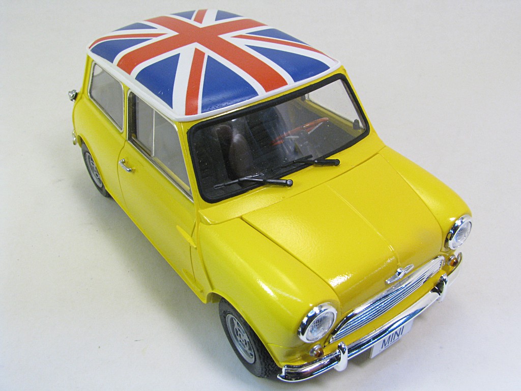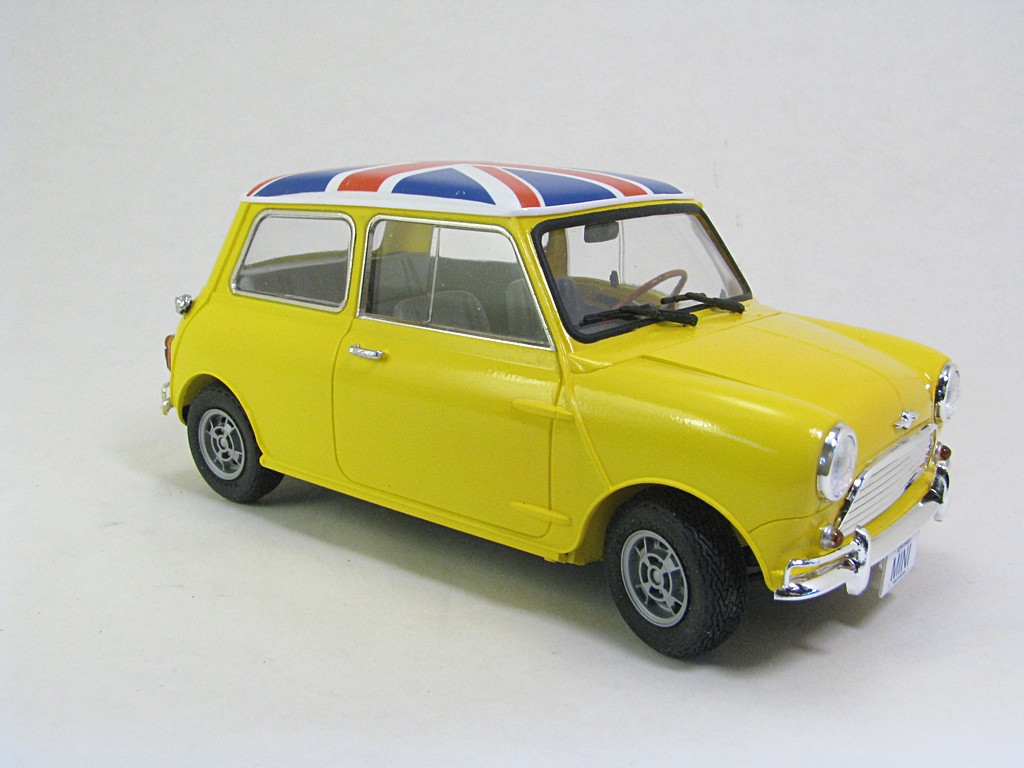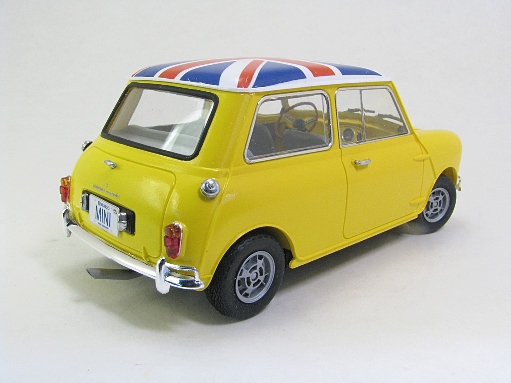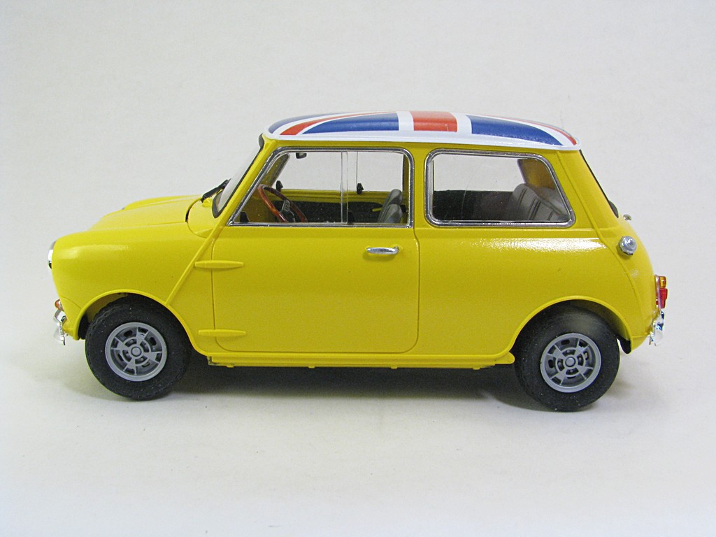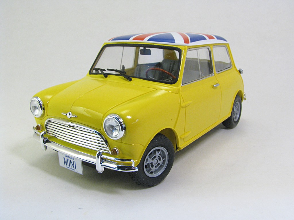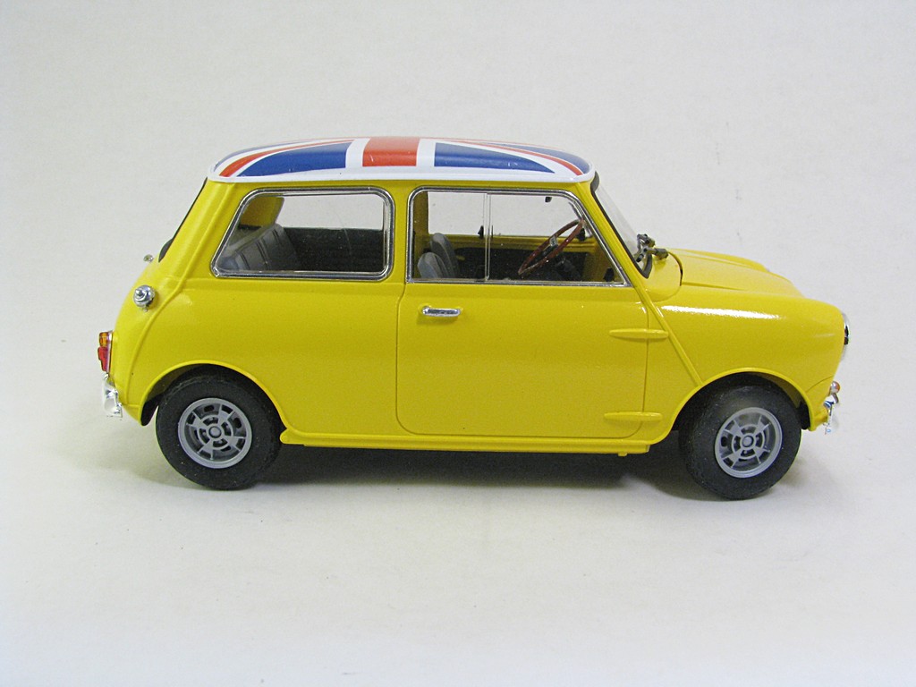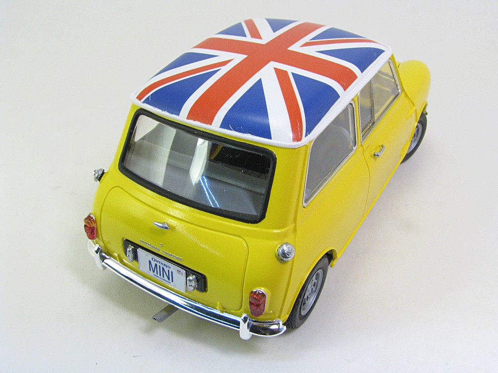 Morris Mini Cooper S Each year, my daughter in law chooses a model for me to build from my collection. This was her choice for 2022, to be done in yellow. Base Kit(s): Tamiya Morris Mini Cooper S (kit number 24014) Finished: November 2022 Modifications/Additions: - RB Motion turned aluminum intake trumpets - RB Motion spark plug boots - some minor additional wiring in engine - changed to left hand drive - flocking on floor - aftermarket Union Jack flag decal for roof - woodgrain steering wheel simulated with red brown, yellow and clear orange topcoat using Tamiya acrylics - paint is a Tamiya TS-16 yellow for the body - Acrylic grays airbrushed (XF-66 light gray and XF-19 sky gray) for interior, followed by semi-gloss clear to simulate the final material sheen Click on Thumbnail to see detailed image. These images are 1024 x 768 and maybe a bit slow to load, depending on your connection speed. |