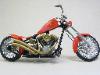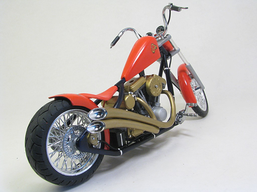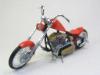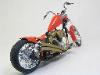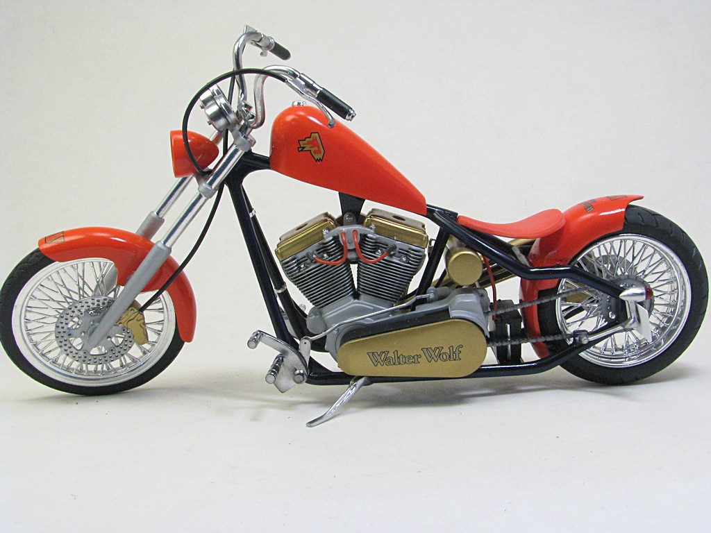 | Walter Wolf Chopper This model started as a built up kit that was given to me at the 2026 Motorcycle Supershow. The idea was to disassemble, strip the paint and rebuild the model during the 2026 24 hour build challenge. Alas, the model was not completed by the 24 hour deadline and the Testor's Chrom Spray paint, that was airbrished, needed to be stripped and done with Alclad chrome. Base Kit(s): Revell-Monogram "Crusader" chopper (kit number 7314) Finished: February 2026 Modifications/Additions: - control cables (clutch and brakes) and gear shift rod - battery wiring - oil lines - spark plugs and wires - rear brake caliper, removed and remounted so that it was close to the disk - 3D printed chainset from Falcon Scale Models (meant for Yamaha YZR-M1) - most frame bolt heads replaced with Meng versions - custom license plate - instrument cluster (from parts box) and gauges - remove bolt heads and replace with Meng pieces - decals from Tamiya Walter Wolf RG250 -- paint is decanted Tamiya TS-55 dark blue (frame) LP bright red (bodywork) TS-31 gold, LP flat aluminum on engine parts, Alclad chrome over LP gloss black (chrome parts) Click on Thumbnail to see detailed image. These images are 1024 x 768 and should load reasonably quickly, depending on your connection speed. |