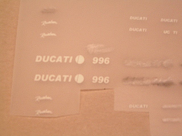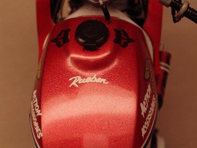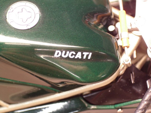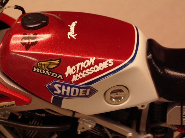 The most comprehensive motorcycling modelling tips can be found at Coaster's Motorcycling Modelling Tips. Instead of reproducing those tips here, I have included motorcycle related tips that I haven't seen at other sites. Newest tips to the bottom. I have published an article on Modelersite.com regarding realistice fork tubes. You can see it here. Then do an author search on Evan Jones. Motorcycle Cables: Below is a chart showing thicknesses of various motorcycle cables and hydraulic lines, and what they would be in 1:12 scale. This is useful for finding the write diameter wire. Dry Transfer lettering/White decals: One of the most difficult decal problems is how to produce white decals with a clear background. A coloured background is usually not a big problem, because you can print the colour onto a white decal sheet and the letters then show up as white. But printers (except for the Alps printer) can't print white ink. I have used dry transer lettering used for model railroading. However, it is limited in the fonts and sizes and can get expensive quickly (especially if you need more than one sheet to spell a word). I found a company based in Vancouver, BC that prepares custom dry transfer lettering. You send them a graphic file and within a week, they send you a sheet of dry transfer lettering, which is very opaque. The company is All Out Graphics and can be found at www.allout-graphics.com. They prefer to have vector graphics files (like from Corel Draw), but I sent them a 300 dpi BMP file, the results were fantastic and the price was very reasonable. I managed to finally get the lettering on the tank of the Honda VF750 Interceptor Superbike and the lettering on the Matrix Ducati 996. Here are some pictures of just the lettering results. For the Honda, I just rubbed the lettering right onto the gas tank. For the Ducati, I first rubbed them onto a clear decal sheet, covered with one coat of Krylon Crystal Clear, then applied them as a regular decal. CA glue applicator: Have you ever struggled to get just the right amount of the thin CA glue on joints? We've all ended up with CA glue where we don't want it, including on our fingers. Go to a store that sells R/C parts and ask for 'control line conduit'. It is a tube of translucent plastic, about 4.67 mm outside diameter (about 3/16") and 2.95 mm inside diameter (about 7/64") and comes in about a 3 foot length. Cut off a small piece long enough so that you can comfortably hold it over a small candle flame (I use birthday candles). After the plastic starts to sag, pull both ends slowly like you are making stretched sprue. Cut in half so you now have two pieces with a very small tube at one end and the other end big enough to fit over the end of a CA glue applicator. You can now place CA glue precisely where you want it on your model joints. The tube will occasionally fill with hardened CA glue. Just cut off small pieces until you get to past the plug. This tip is thanks to the Guelph Plastic Modellers Group. BEWARE Future floor finish Since decals do not adhere well to flat painted surfaces, it has been widely suggested that Future floor finish be used underneath any decals. However, Future tends to react with water and leaves a milky residue that is almost impossible to get rid of. I had to redo the Star Trek Enterprise because of this problem. I don't know if it's due to the formulation in Canada, or a lack of curing time. I have since used clear gloss acrylic paint underneath decals on flat paints and then following with clear flat acrylic. Mesh carburetor intakes: Oftentimes, carbs on racing bikes do not have air filters. However, a wire mesh screen is placed over the mouth of the carburetor to prevent large pieces of dirt from entering. These can be made from brass wire mesh which is available from hobby shops, often in the model trains area. Drill a hole in a scrap piece of wood about the same diameter as the carb throat. Place the mesh over the hole close to a corner of the mesh. Find a dowel of a slightly smaller diameter than the hole. Sand the end so that it is rounded into a hemisphere and then press into the mesh to form a dome. Making the impression close to a corner of the mesh allows some of the material to be drawn into the dome and making it deeper. Cut the dome you have made out of the mesh sheet and superglue onto carb opening. You will probably need to make a few extras because it is difficult to cut the mesh exactly. You can paint silver or leave the natural brass colour. Kickstand spring: There are two ways to add a spring to a kickstand, either a centrestand or a sidestand