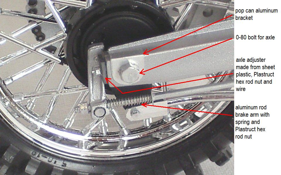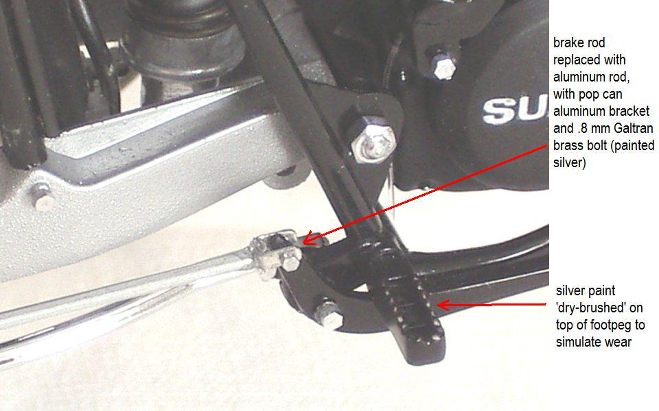 perfect for a kickstand. You will need to bend the last loop on each end at 90° for attaching to the model. You will also need to add a mounting pin and/or holes to attach the spring. The spring is quite stiff Wrap small wire around a drill shaft to get the right diameter spring. Aluminum wire bend quite easily. If you want a stiffer spring, you can use steel guitar string wire. Banjo fittings: At the end of hydraulic lines (brake and clutch), there are banjo joints. These can be replicated by taking the appropriate sized aluminum wire and squeezing in a pair of pliers or vice without any teeth. Drill a hole for a miniature bolt and file the piece to shape. Shown on the right is a banjo joint added to a hyraulic clutch. Brake Disks and poor man's lathe: Brake disks that come in most plastic kits are usually thicker than they should be for scale realism. If you have a variable speed drill that you can lock the speed at a certain setting, then you can thin these disks quite easily. You will need to find some way to mount the drill so that it doesn't move, and some way of mounting the disk so that you can spin it in the drill. Set the speed quite low to start and then use a file to remove material. You can't apply too much pressure, just be patient. I usually leave the scratch marks on the disc if they are representing steel brakes. Brake Calipers: In most plastic kits, the back side the brake calipers are usually left off to make them easier to manufacture. Filling in the back can make the calipers more realistic, especially with spoked wheels. Add a piece of sheet plastic to fill in the back, making sure you leave enough space for the disc. Below are two examples of calipers that have had the backs filled in. Exhaust Pipes: In some projects, you may want to modify existing exhaust pipes, or scratchbuild a complete set. Two ways you can do this are the following:
